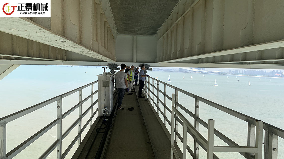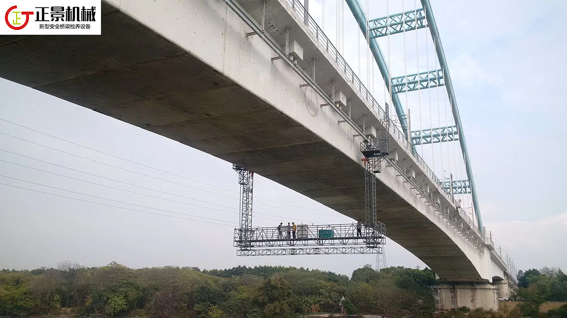 正景機械生產的固定式橋檢車(橋梁檢查車),專為大中型橋梁定制,適合懸索橋、斜拉橋、鋼箱橋梁等,作為一種橋梁附屬設施存在。固定式橋梁檢測車(橋梁檢查車)是行走機構通過鋼輪倒置于工字鋼軌道上,車架與行走機構相連,在電機或者柴油機或者汽油機的驅動下運行,能方便工作人員對橋梁底部進行全方位檢查。車架上部安裝焊接有花紋鋼板或鋼板網,便于工作人員工作行走。